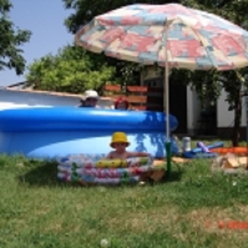 Meleg júliusi délelőtt hűsöl a család, ki-ki a neki megfelelő méretű medencében...(Anya a pillanat megörökítése után csobbant...) Így el lehet viselni a hőséget...:))