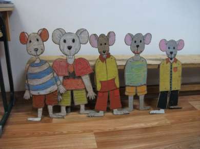 Mi kétfajta pályaművel is készültünk: az egyik a mozgatható kezű és lábú szereplők: Rumini, Balikó, Dundi Bandi, Negró és Galléros Fecó (habár tudjuk, hogy Fecó csak a második kötetben tűnik fel). A bábok ötletét mi adtuk, Anna néni kivágta kartonból, mi pedig kiszíneztük.